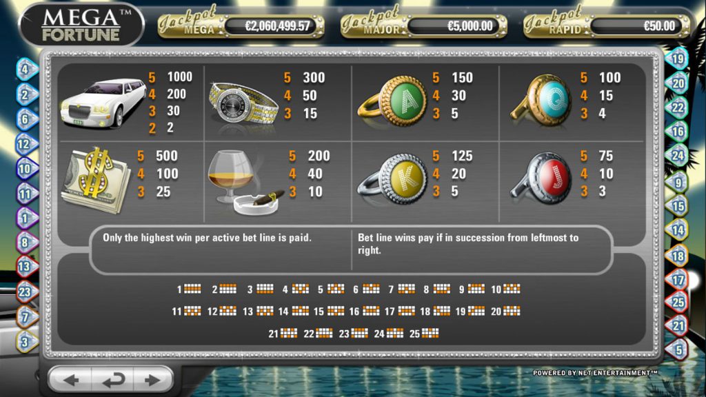 Mega Fortune Slot menampilkan tata letak lima gulungan standar, tiga baris dengan 25 garis pembayaran tetap. Pemain dapat menyesuaikan taruhan mereka agar sesuai dengan anggaran mereka, sehingga dapat diakses oleh pemain biasa dan pemain papan atas. Game ini terkenal dengan fitur-fiturnya yang menarik, antara lain: